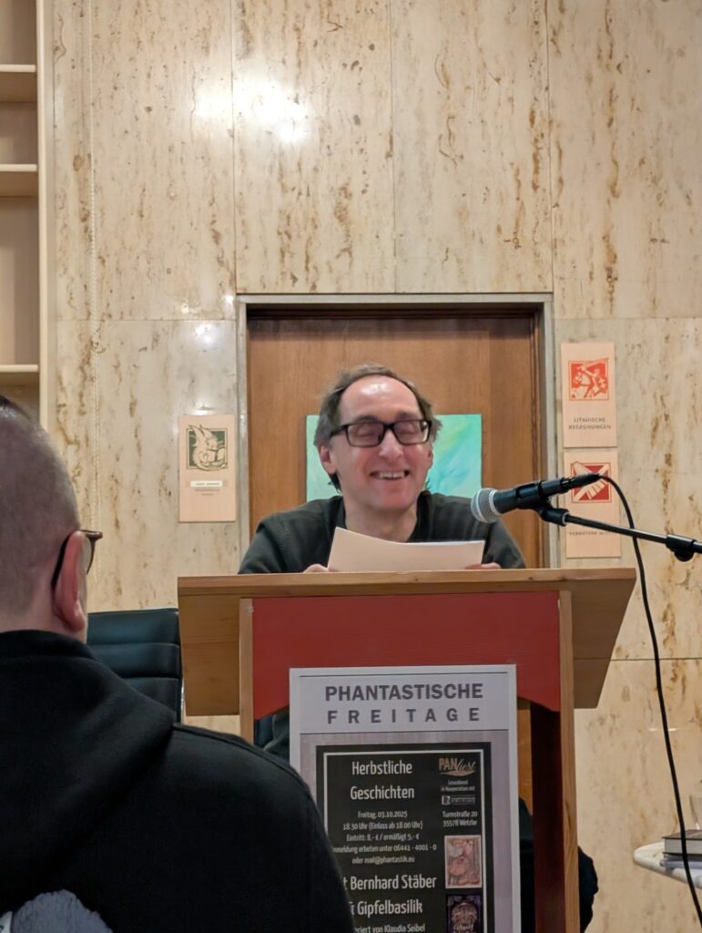 Dann war schon ich dran und las aus meinen »Myzelchroniken«. Es hat mir sehr viel Freude bereitet, nachdem ich jetzt so lange in Band 3 unterwegs war, mal wieder in Band 1 einzusteigen und Teile daraus vorzutragen.